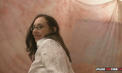 Bawdy brunette in glasses moans as a thick boner pulverizes her tight cunt